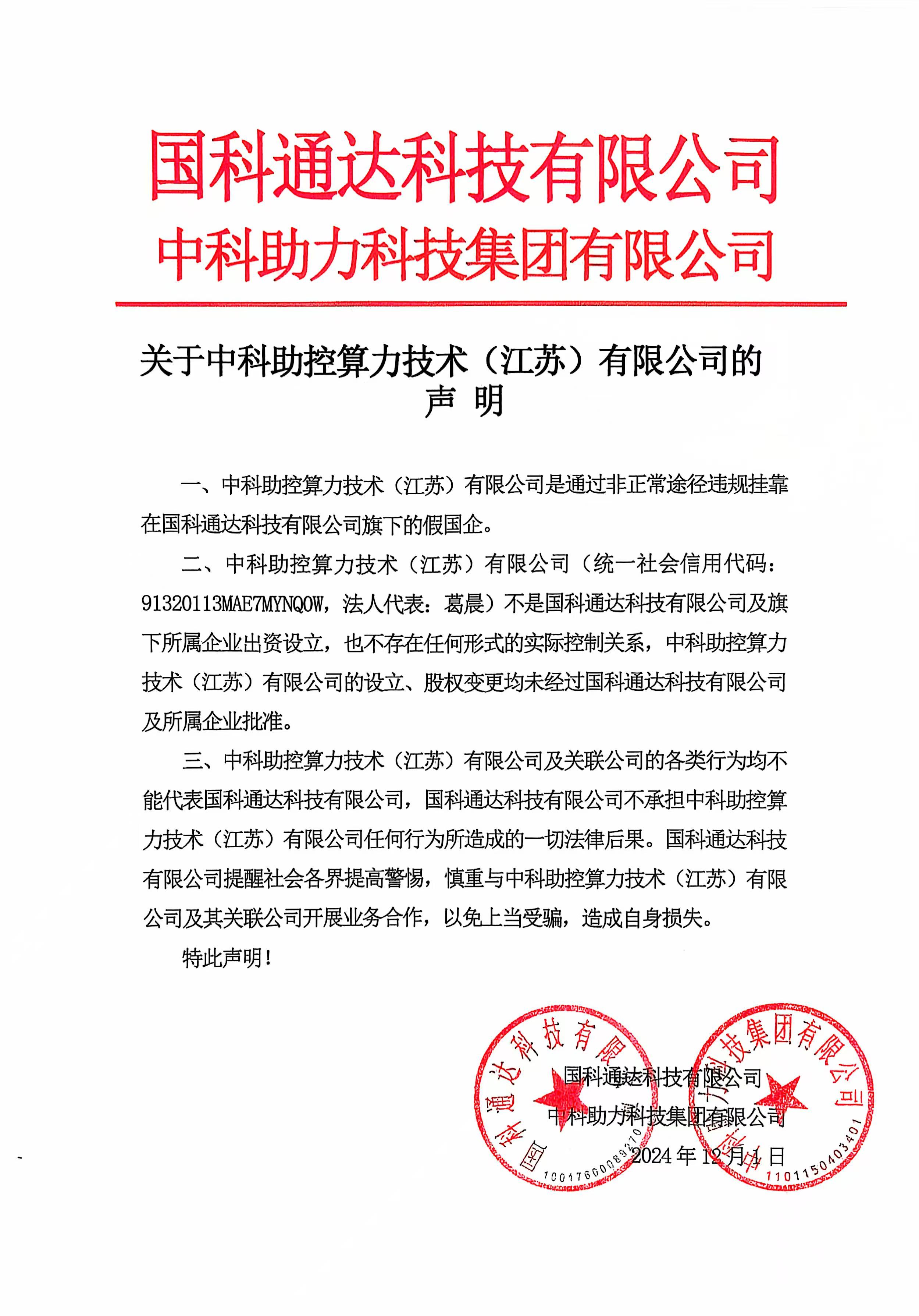 關(guān)于中科助控算力技術(shù)(江蘇)有限公司的聲明 一、中科助控算力技術(shù)(江蘇)有限公司是通過非正常途徑違規(guī)掛靠在國科通達(dá)科技有限公司旗下的假國企。二、中科助控算力技術(shù)(江