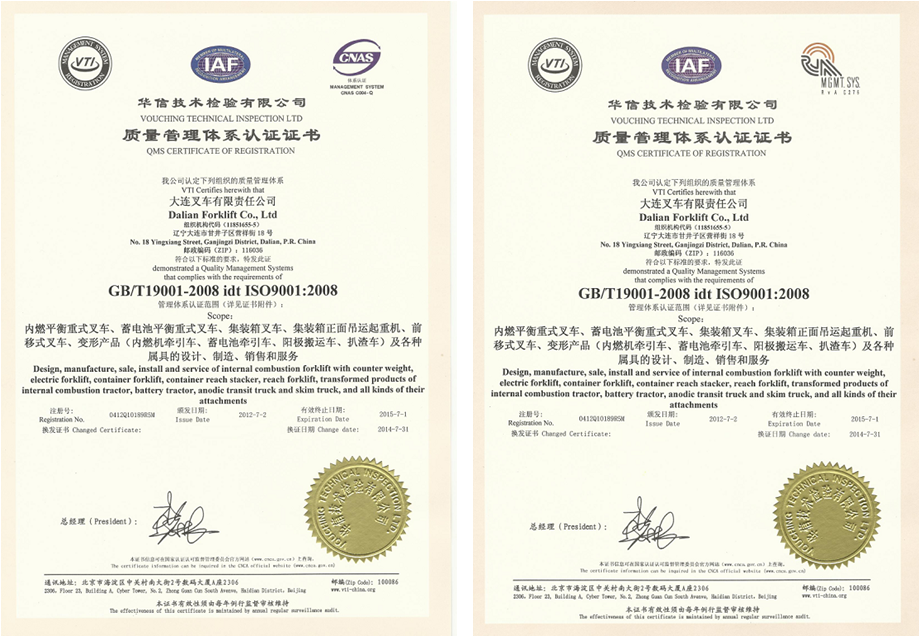 經(jīng)評審,按照GB/T19001-2008 idt ISO9001:2008標準的要求,公司質(zhì)量管理體系順利通過審核。在本次審核過程中,對公司質(zhì)量體系覆蓋范圍進行了擴容,增加了前移式叉車,規(guī)格型號為CQD20型(2.0t及以下)。